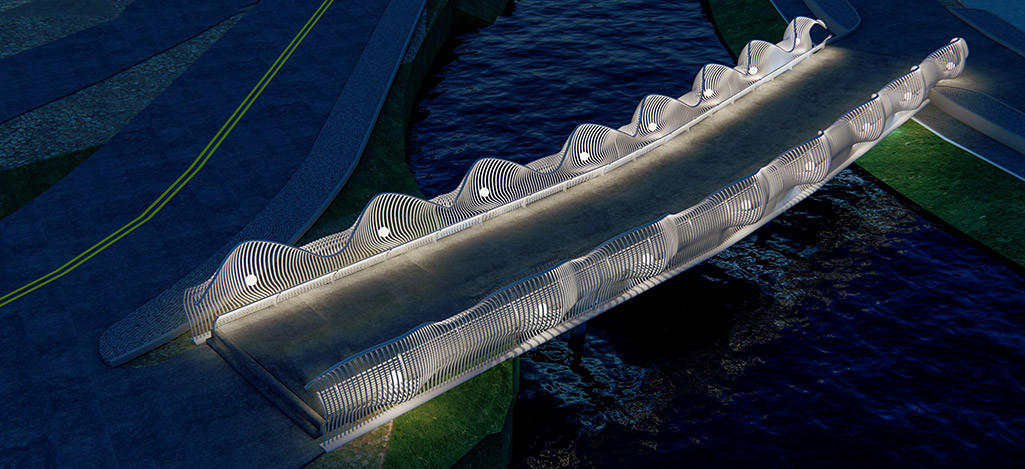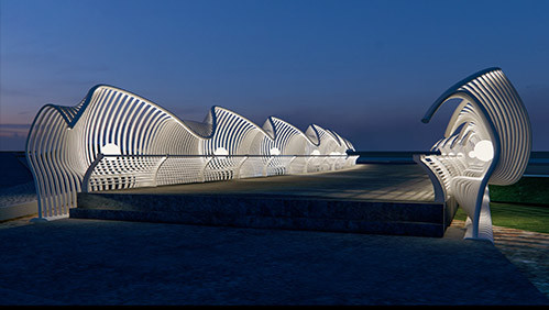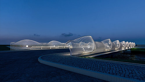 Inspired by "a mollusk nurturing a pearl," the bridge's arched form, illuminated by linear wall washers, creates a luminous shell. Spherical sconces arranged along its span resemble pearls cradled within this structure, visualizing "light as the shell, nurturing luminous pearls." The design embodies nature-urban symbiosis, symbolizing how beauty develops, matures, and shines within its environment.